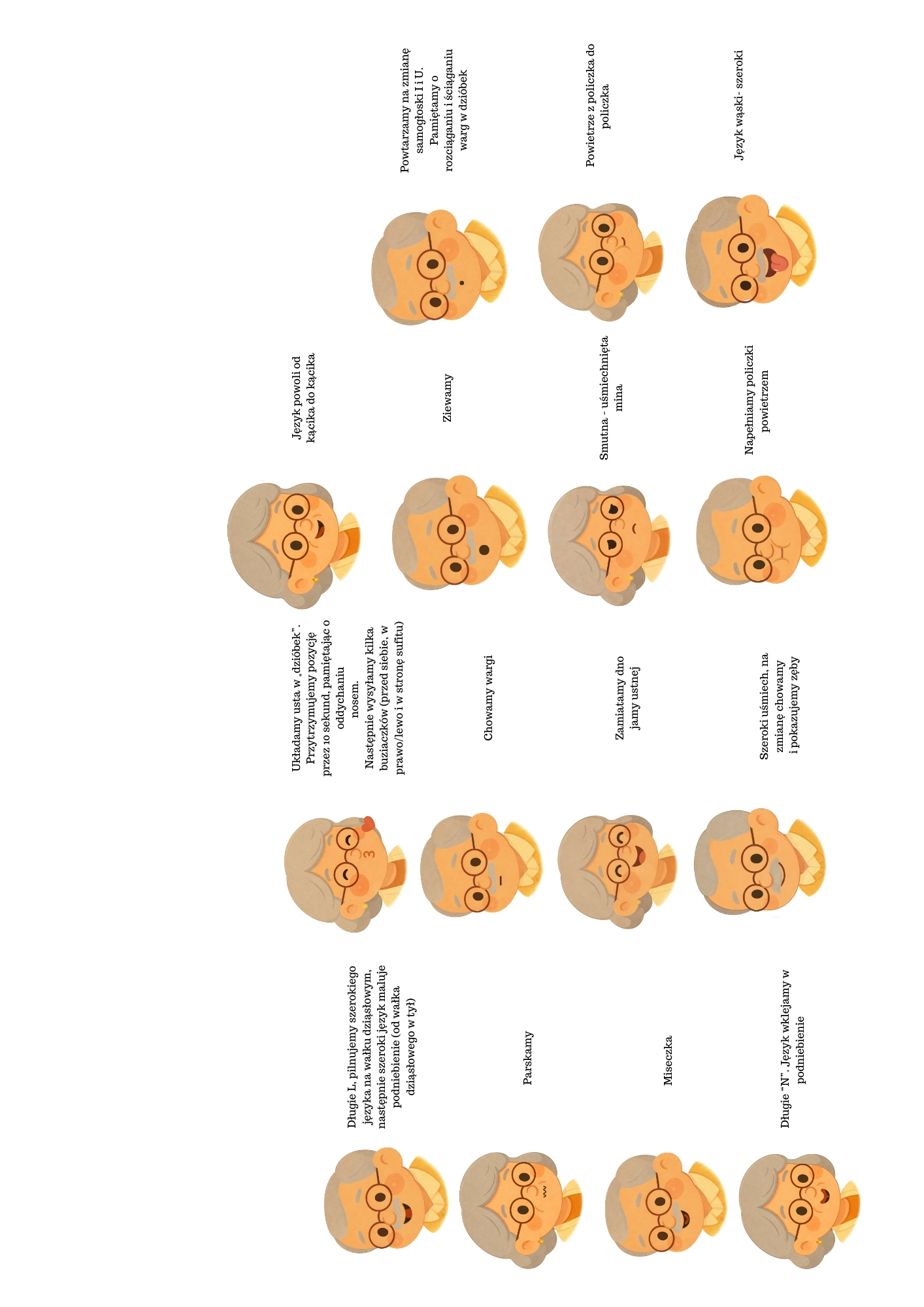 Jeśli na obu kartach Babcia i Dziadek wykonują ten sam ruch buzi, języka lub warg – para zostaje znaleziona. Następnie dziecko naśladuje pokazane ćwiczenie artykulacyjne.