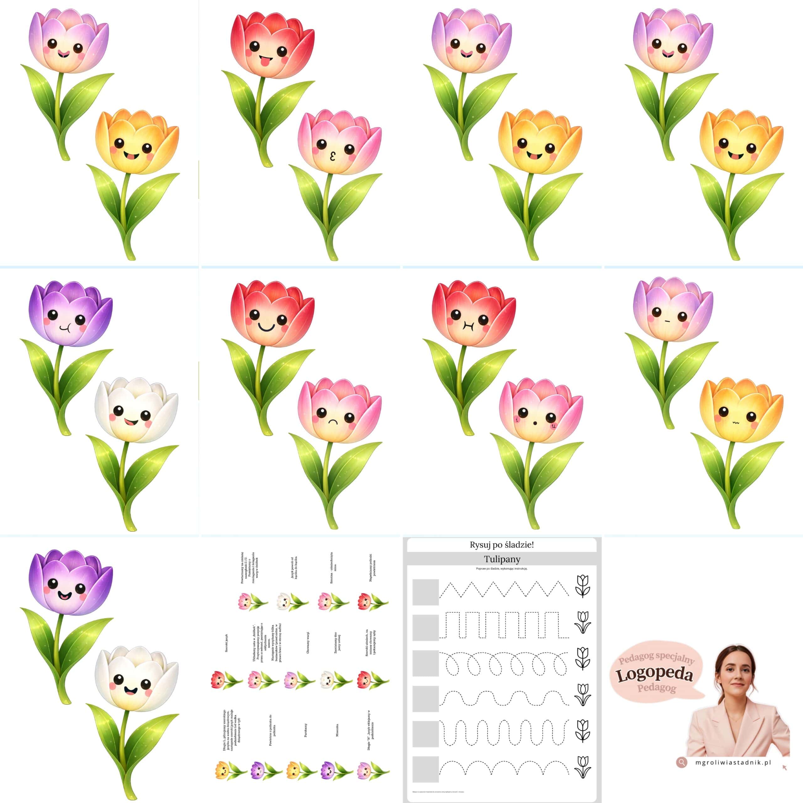 Ćwiczenia artykulacyjne – karty pracy z motywem tulipanów dla dzieci