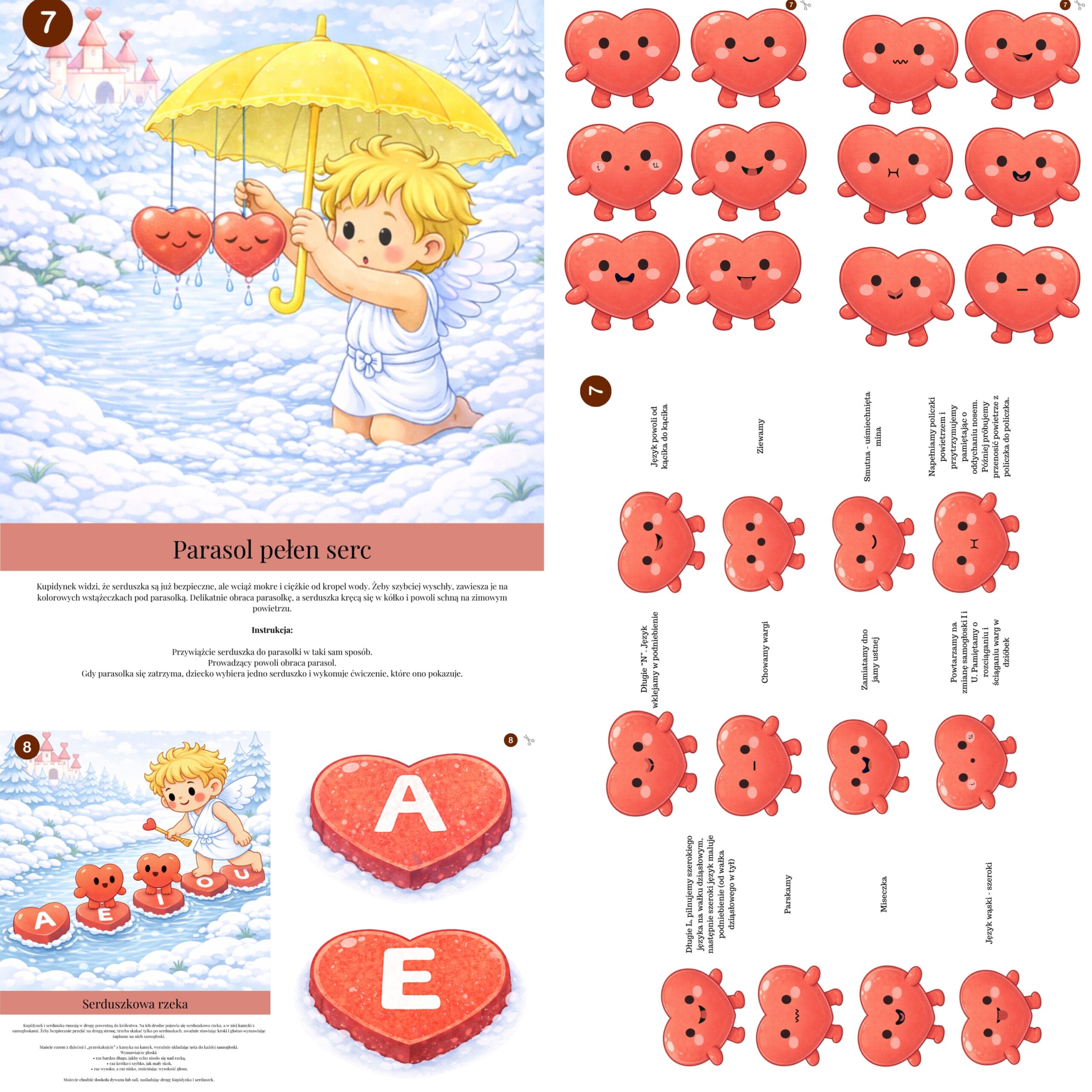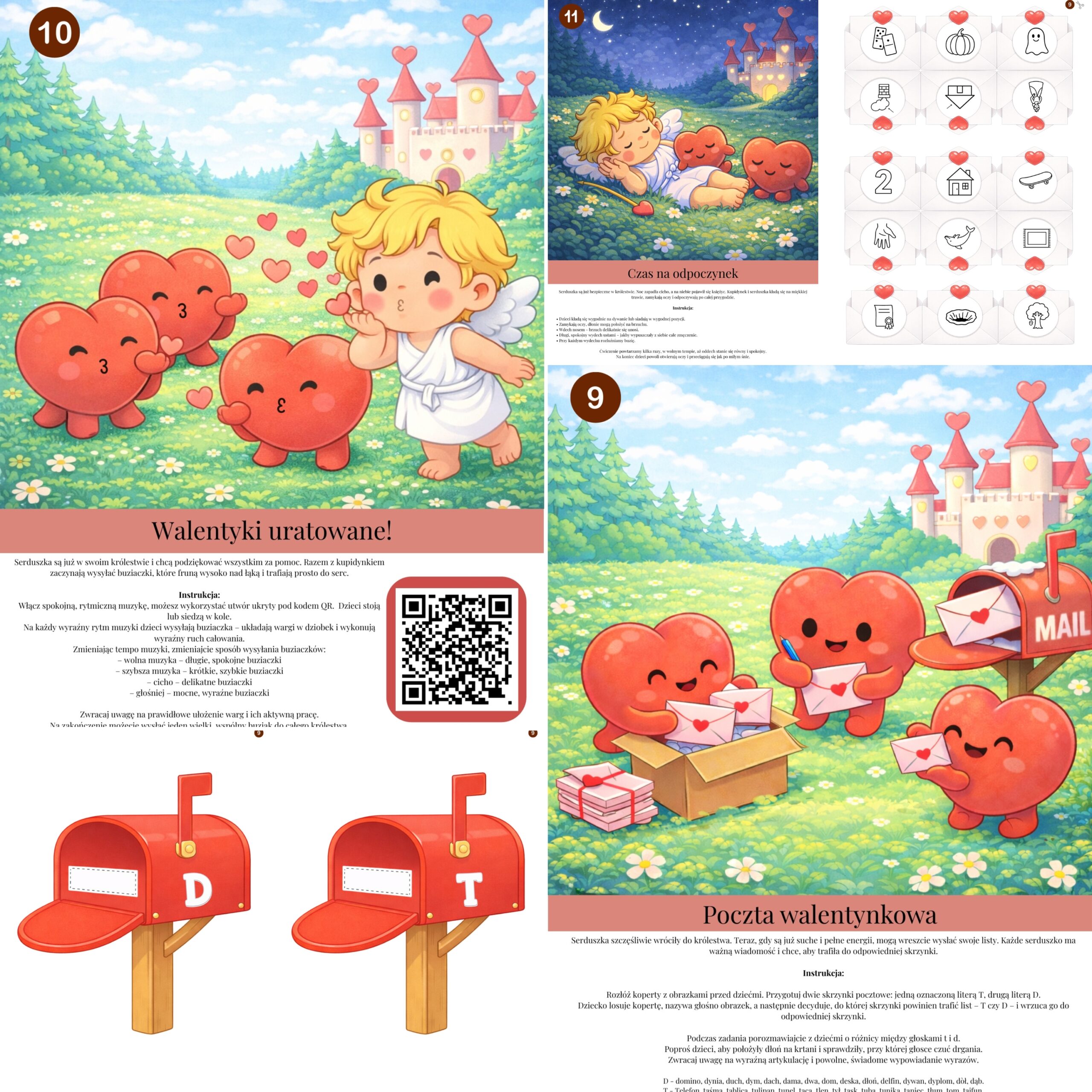 „Przygody Kupidynka” to zestaw kart logopedycznych w formie spójnej, angażującej historii, która prowadzi dzieci przez serię ćwiczeń wspierających rozwój mowy, oddechu i świadomości artykulacyjnej. Materiał idealnie sprawdzi się podczas zajęć grupowych w przedszkolu, gabinecie logopedycznym oraz w pracy terapeutycznej.