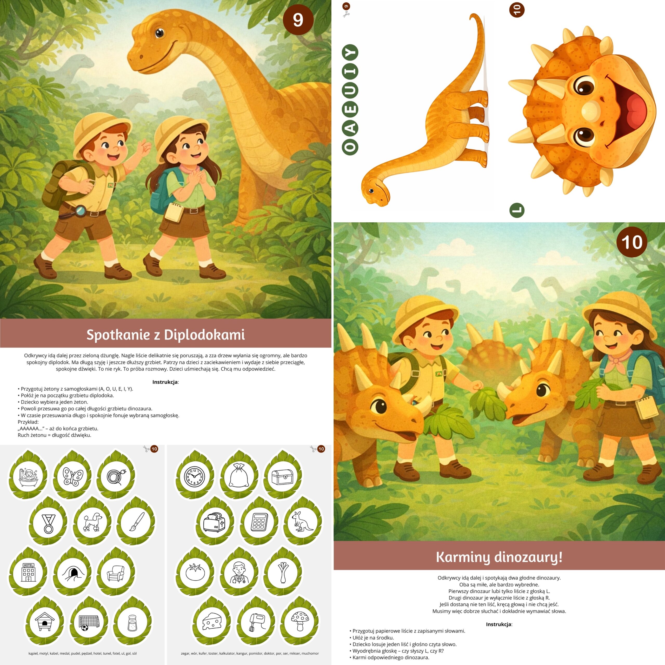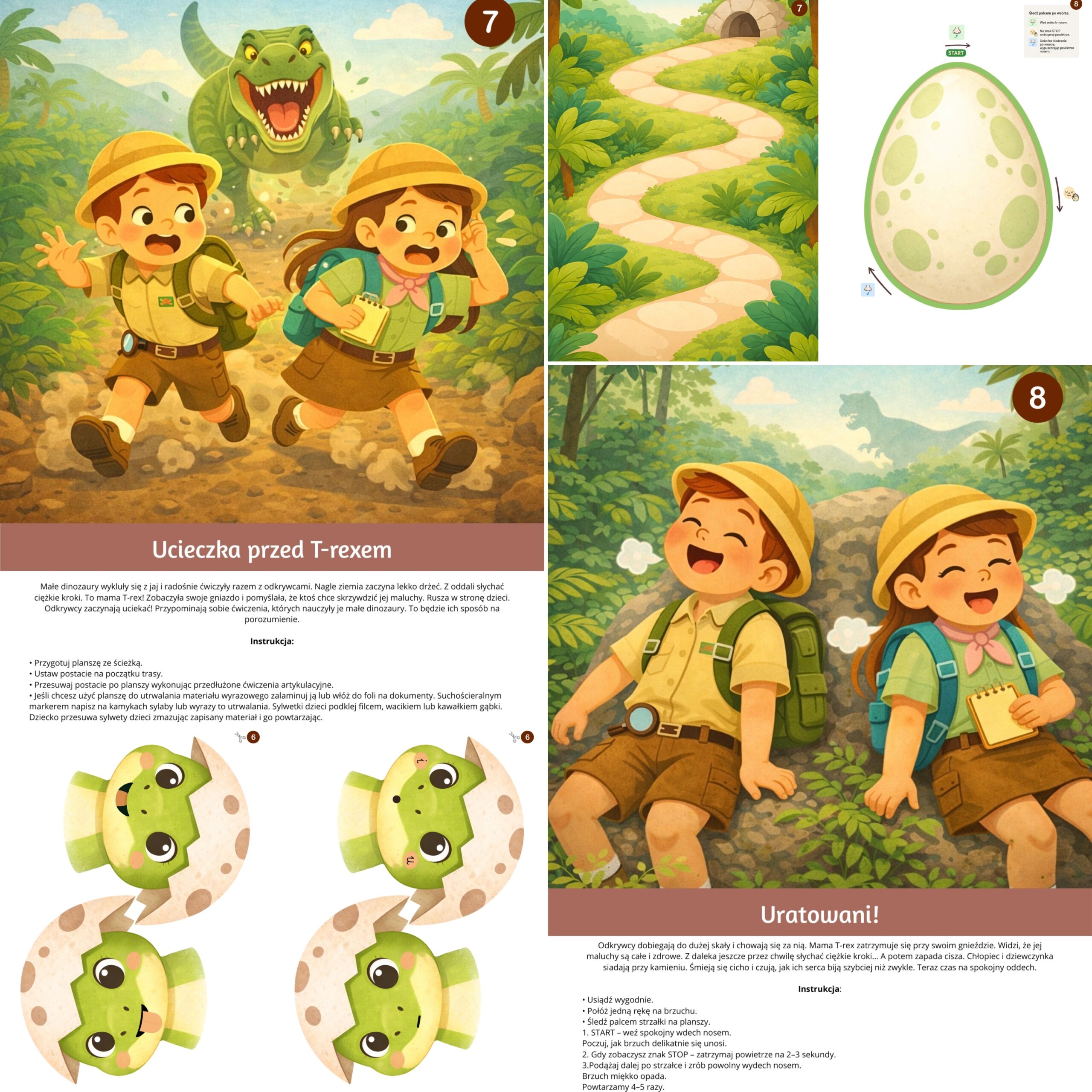 Karty logopedyczne – Przygody w krainie dinozaurów to rozbudowany, angażujący zestaw terapeutyczny dla dzieci w wieku przedszkolnym i wczesnoszkolnym. Materiał został stworzony z myślą o logopedach, terapeutach i nauczycielach, którzy chcą prowadzić ćwiczenia artykulacyjne w formie zabawy, opartej na spójnej fabule i atrakcyjnych ilustracjach.
