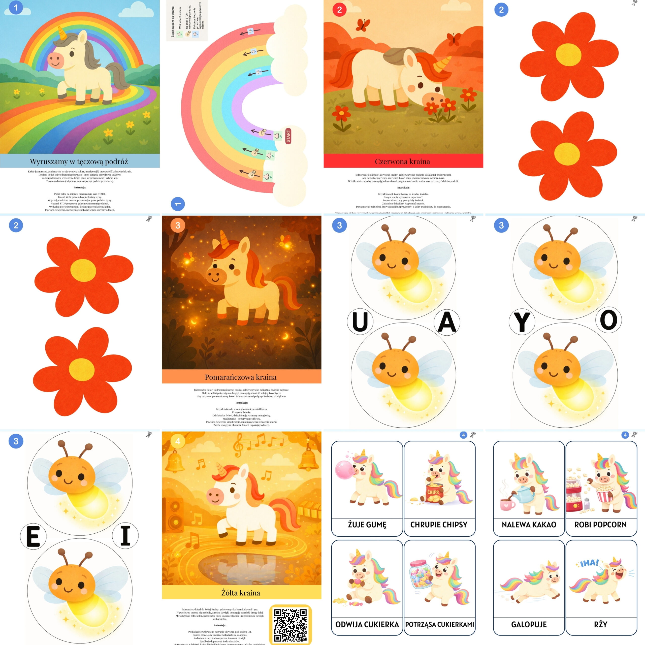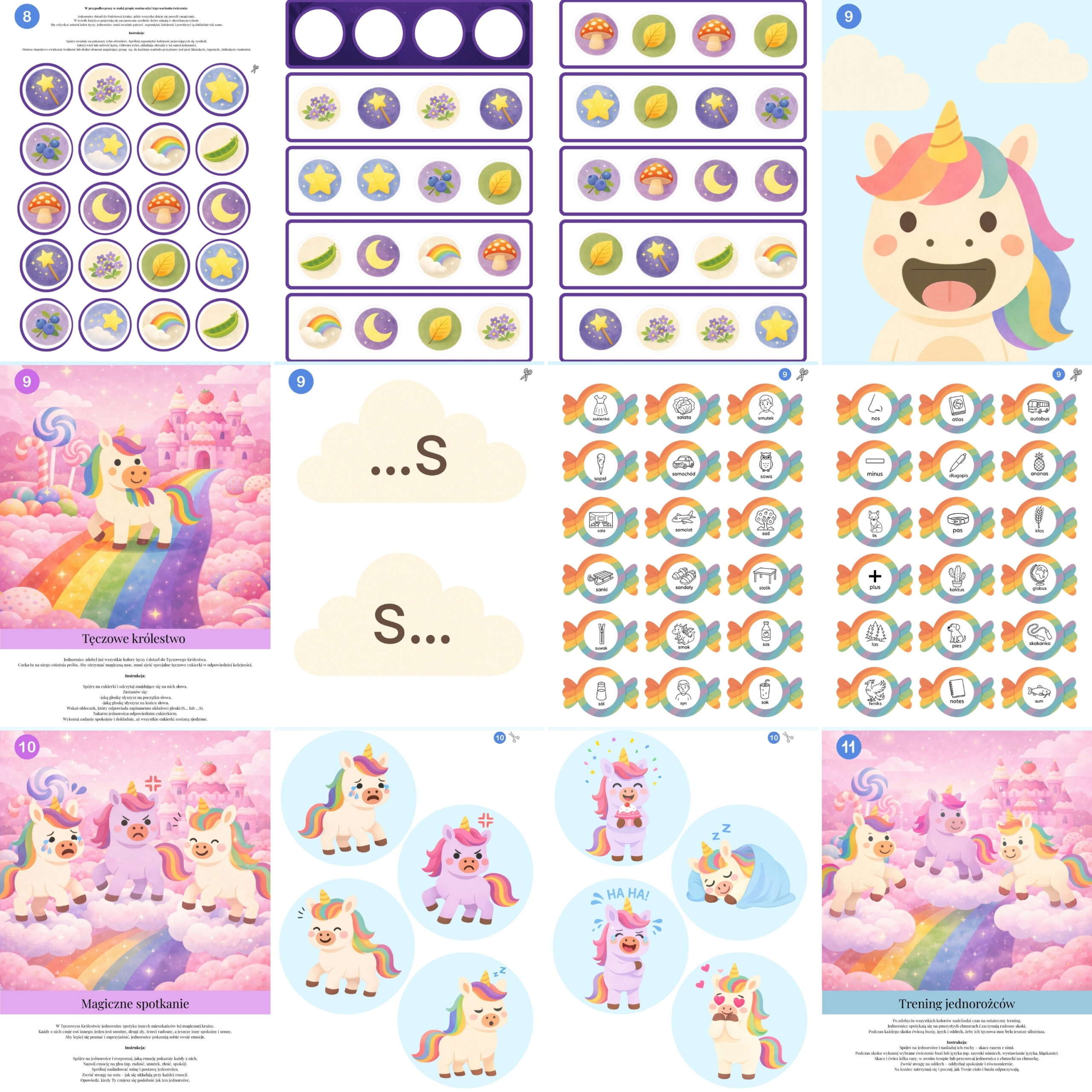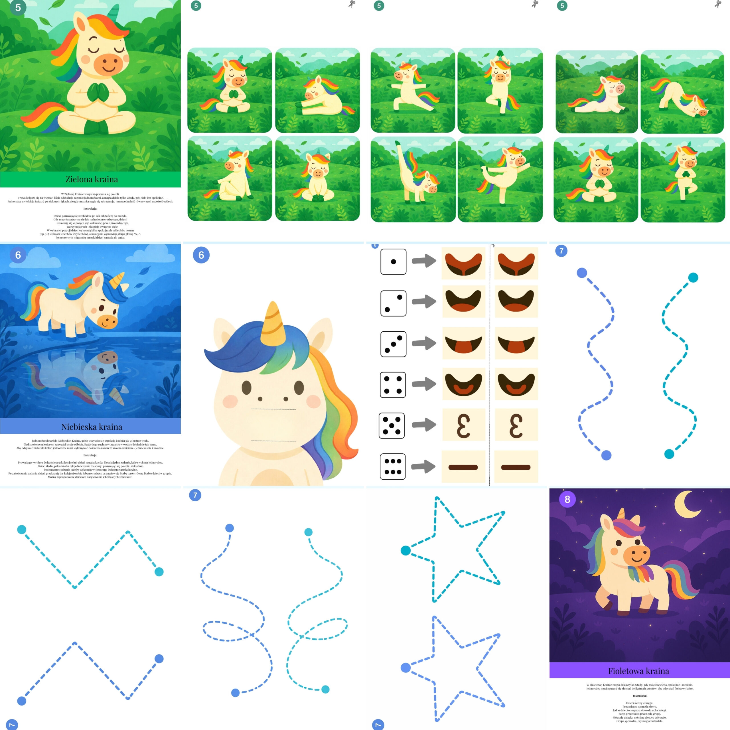 „Przygody w krainie jednorożców” to zestaw kart logopedycznych stworzonych z myślą o zajęciach grupowych, które łączą terapię mowy z ruchem, oddechem i elementami zabawy. Materiał oparty jest na spójnej fabule – podróży jednorożca przez kolejne krainy – co zwiększa zaangażowanie dzieci i ułatwia utrzymanie uwagi w trakcie zajęć.