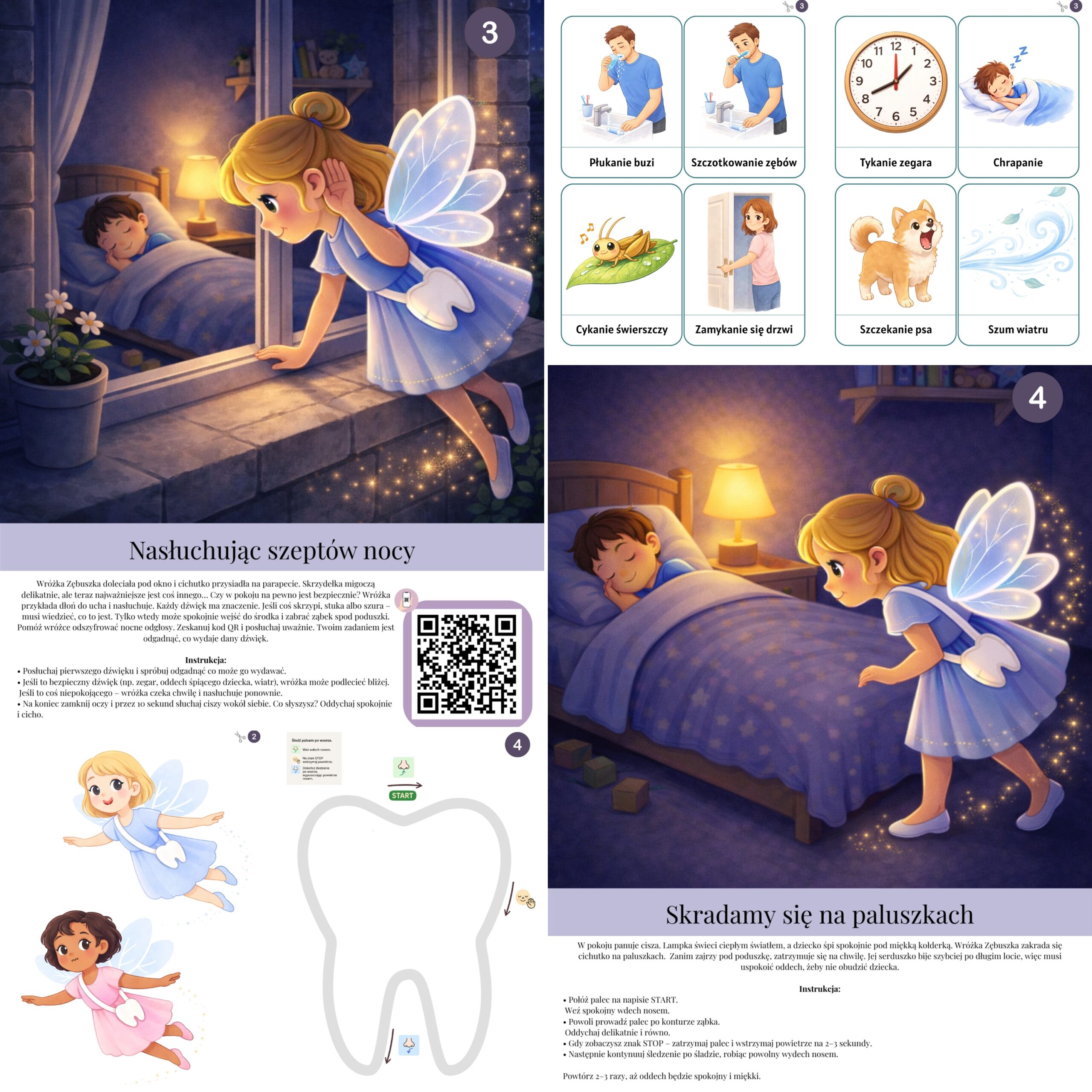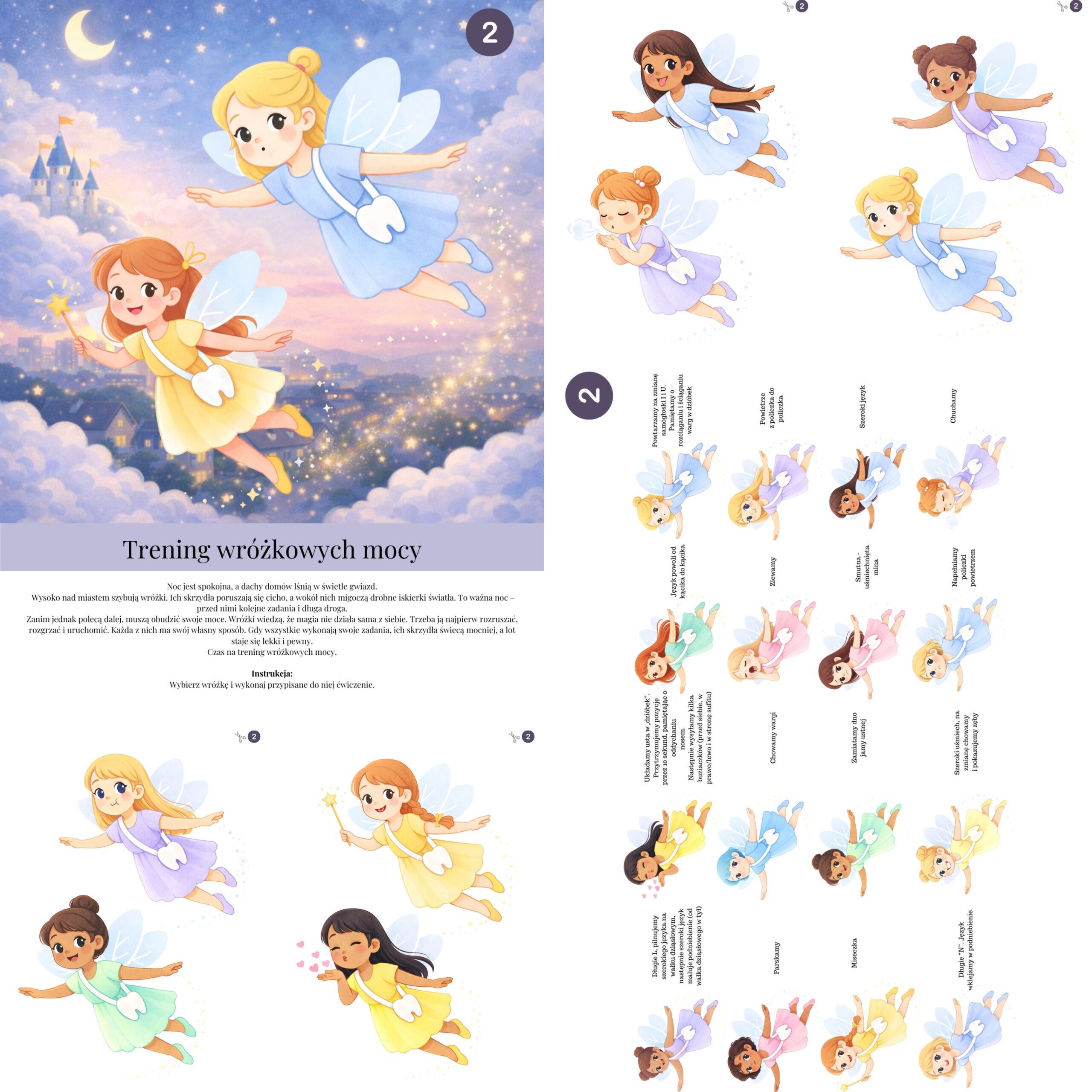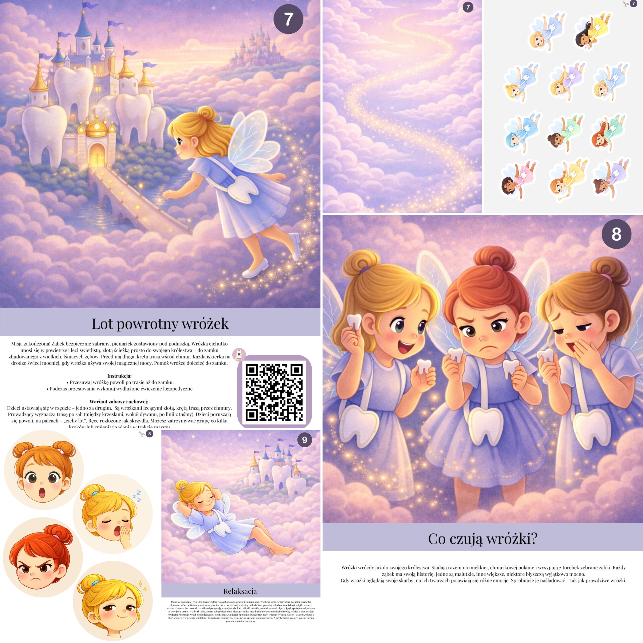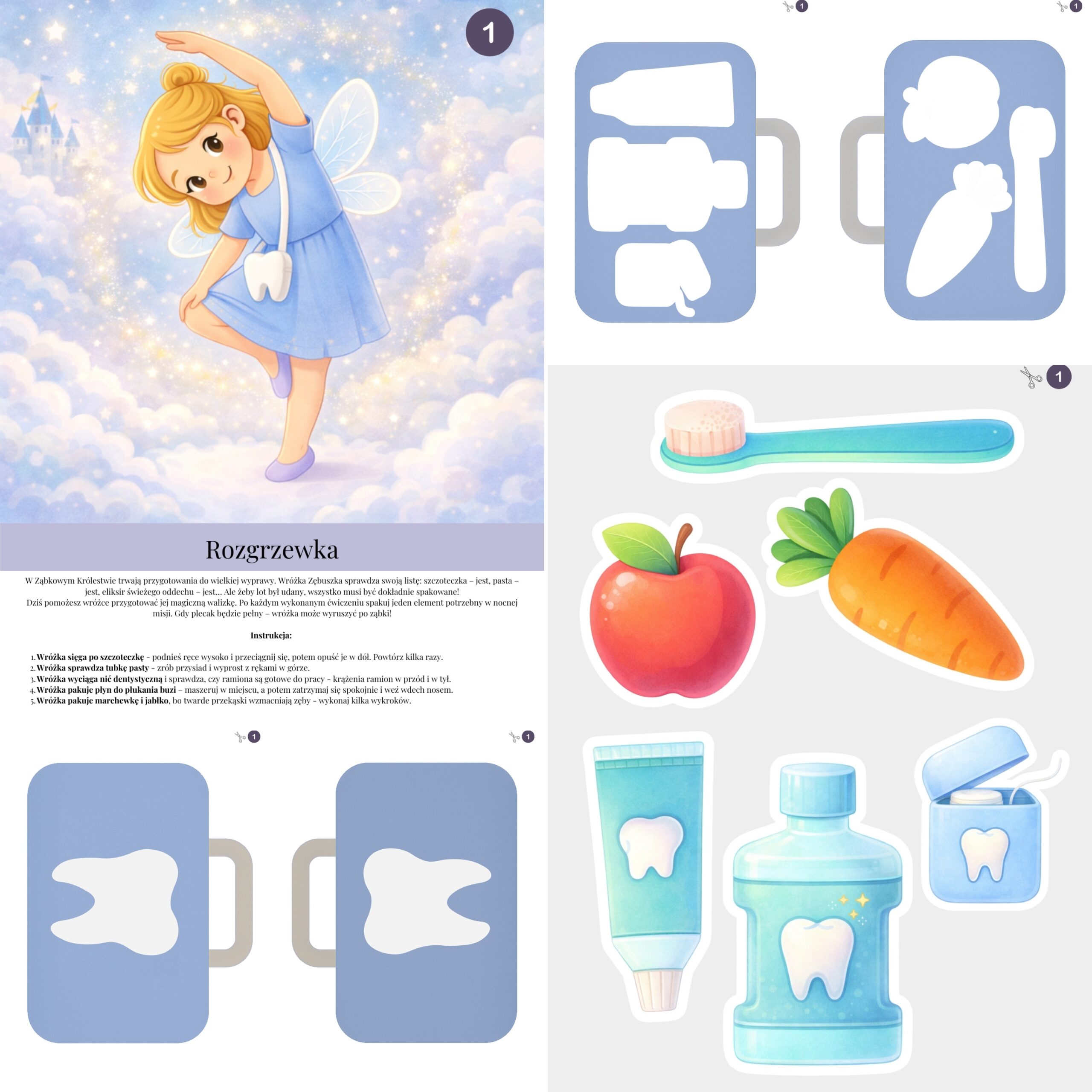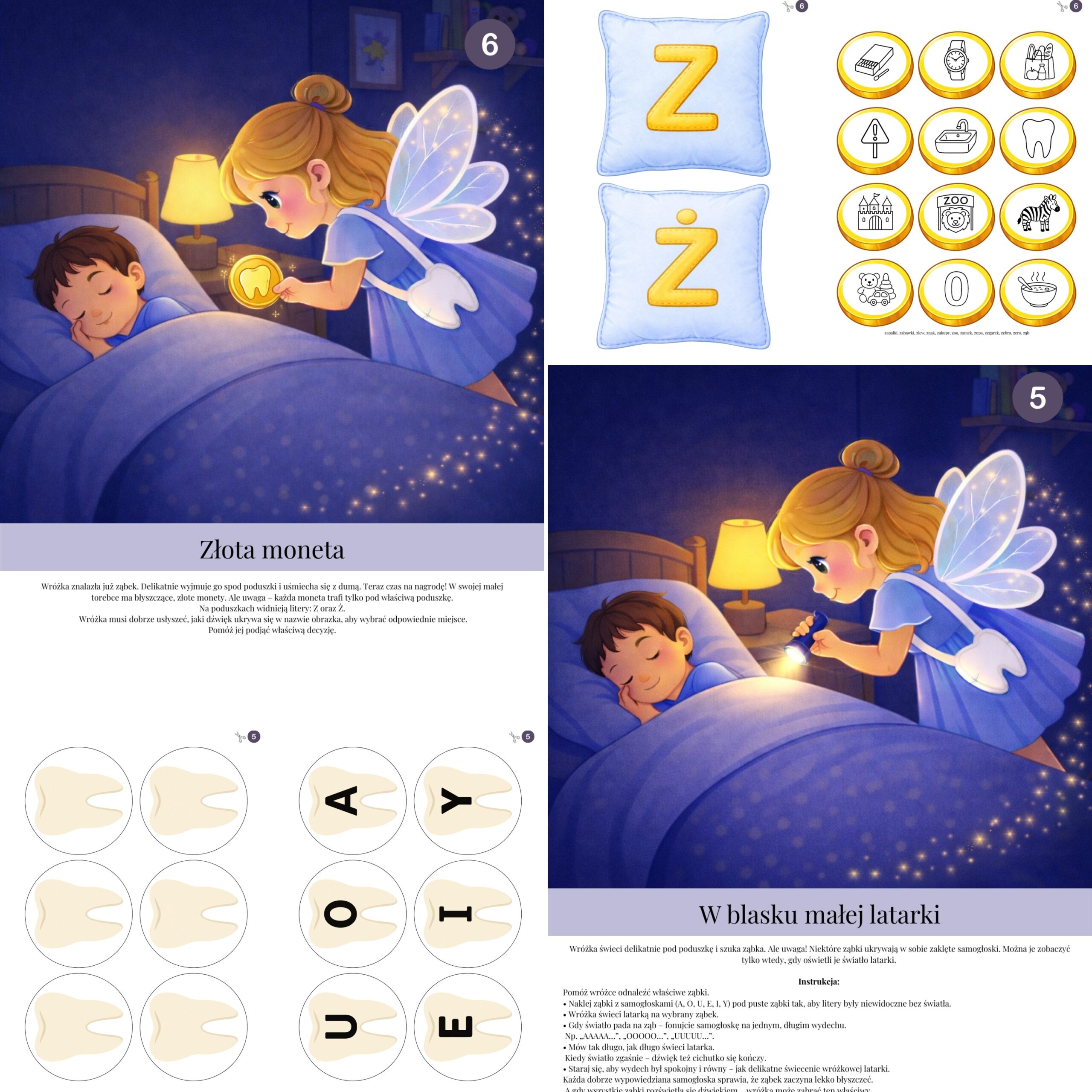 Zestaw „Przygody w krainie Wróżki Zębuszki” to karty logopedyczne, które dzieci wykonują z radością – bez nudy i przymusu, za to z uśmiechem, ciekawością i prawdziwym zaangażowaniem.