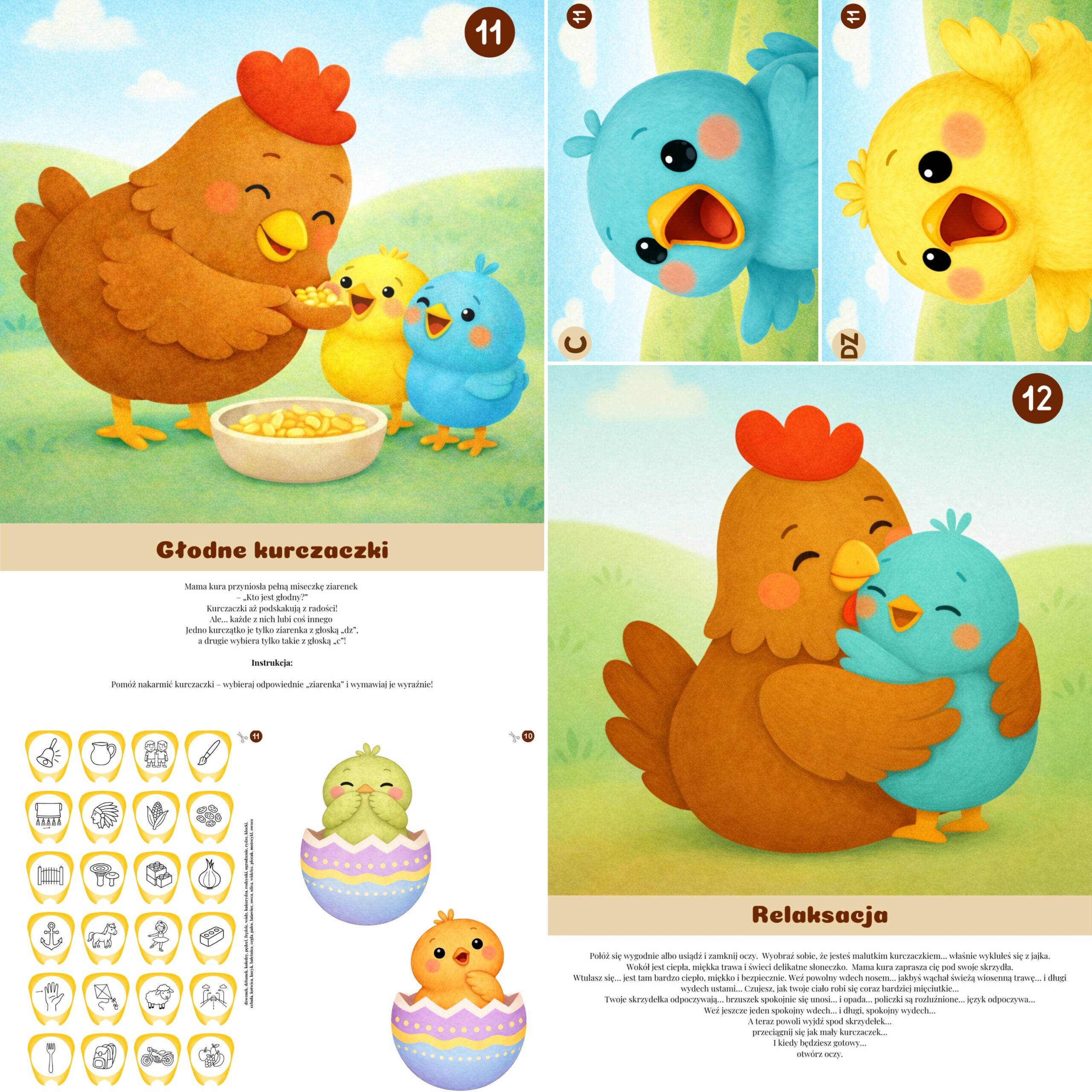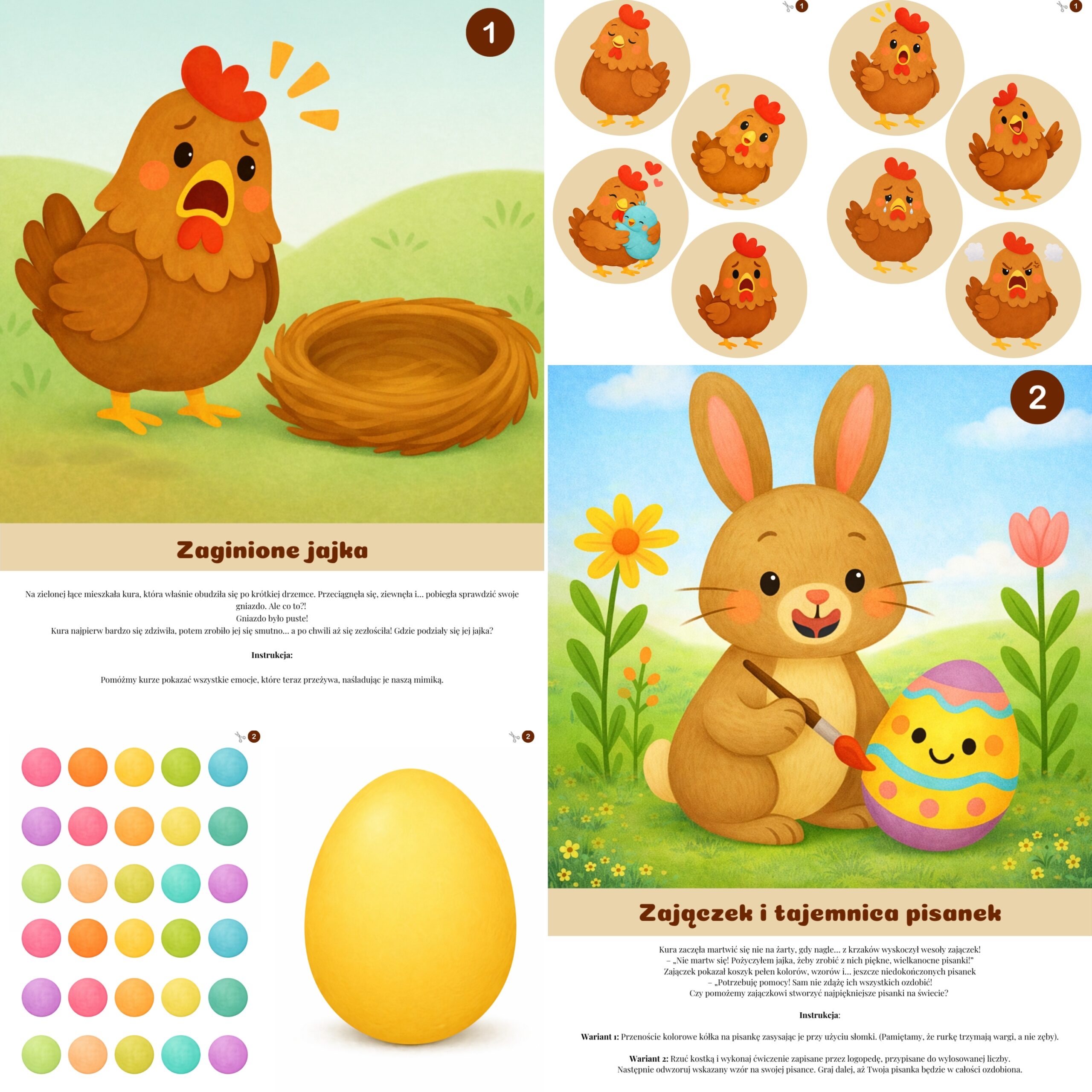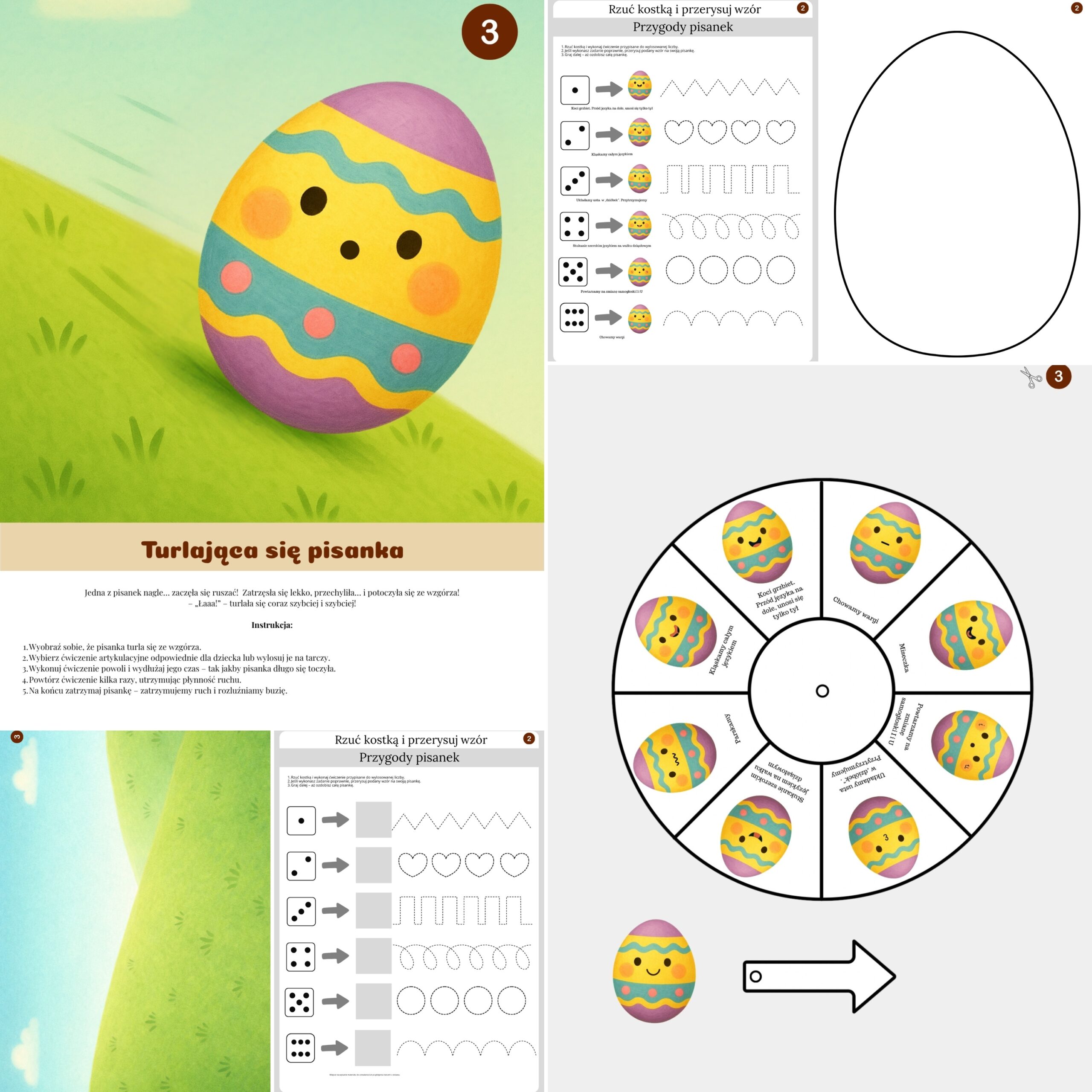 Ten wyjątkowy zestaw to gotowy materiał do prowadzenia angażujących zajęć opartych na spójnej, bajkowej fabule. Dzieci wyruszają w wielkanocną przygodę, w której pomagają odnaleźć i uratować pisanki, a przy okazji wykonują różnorodne ćwiczenia logopedyczne.