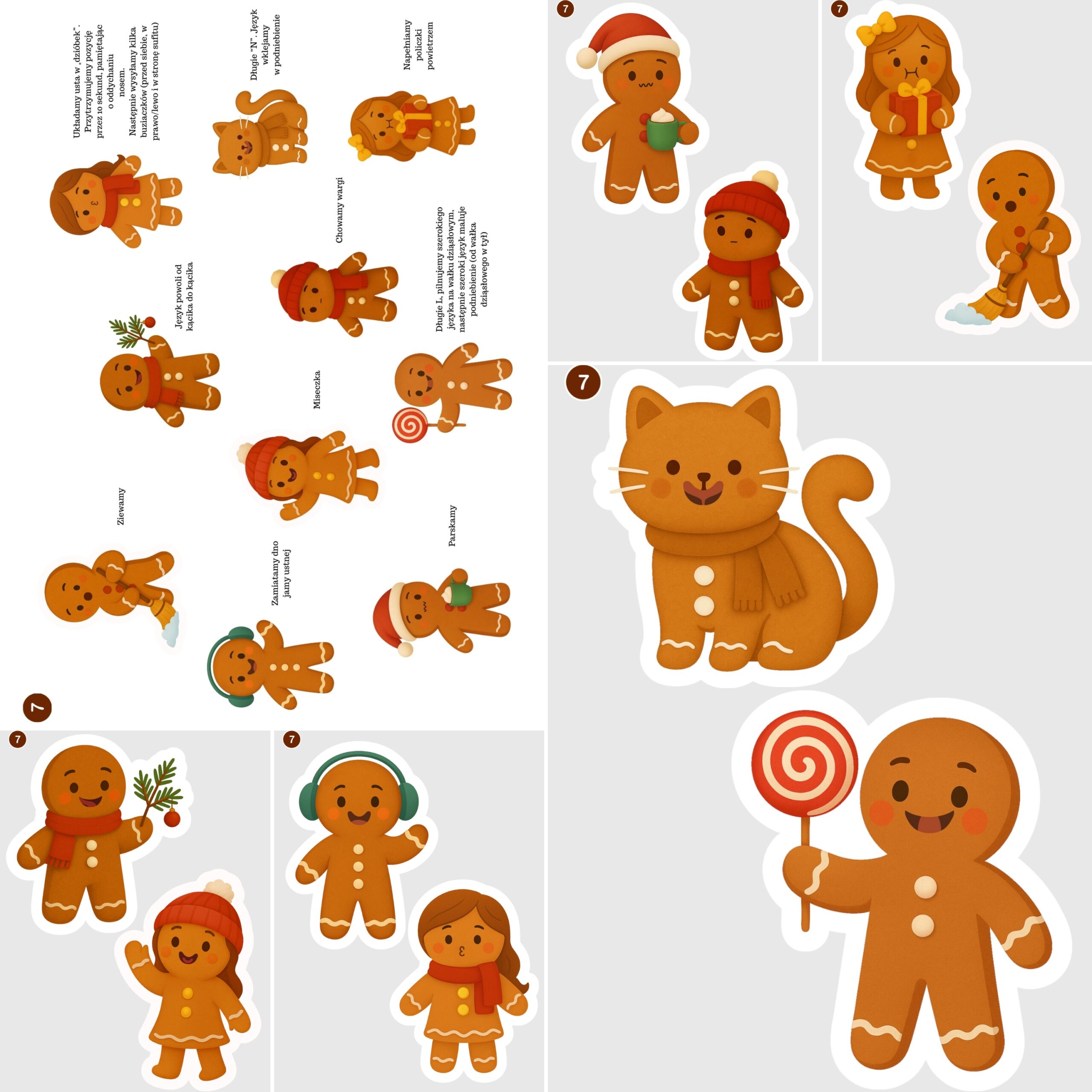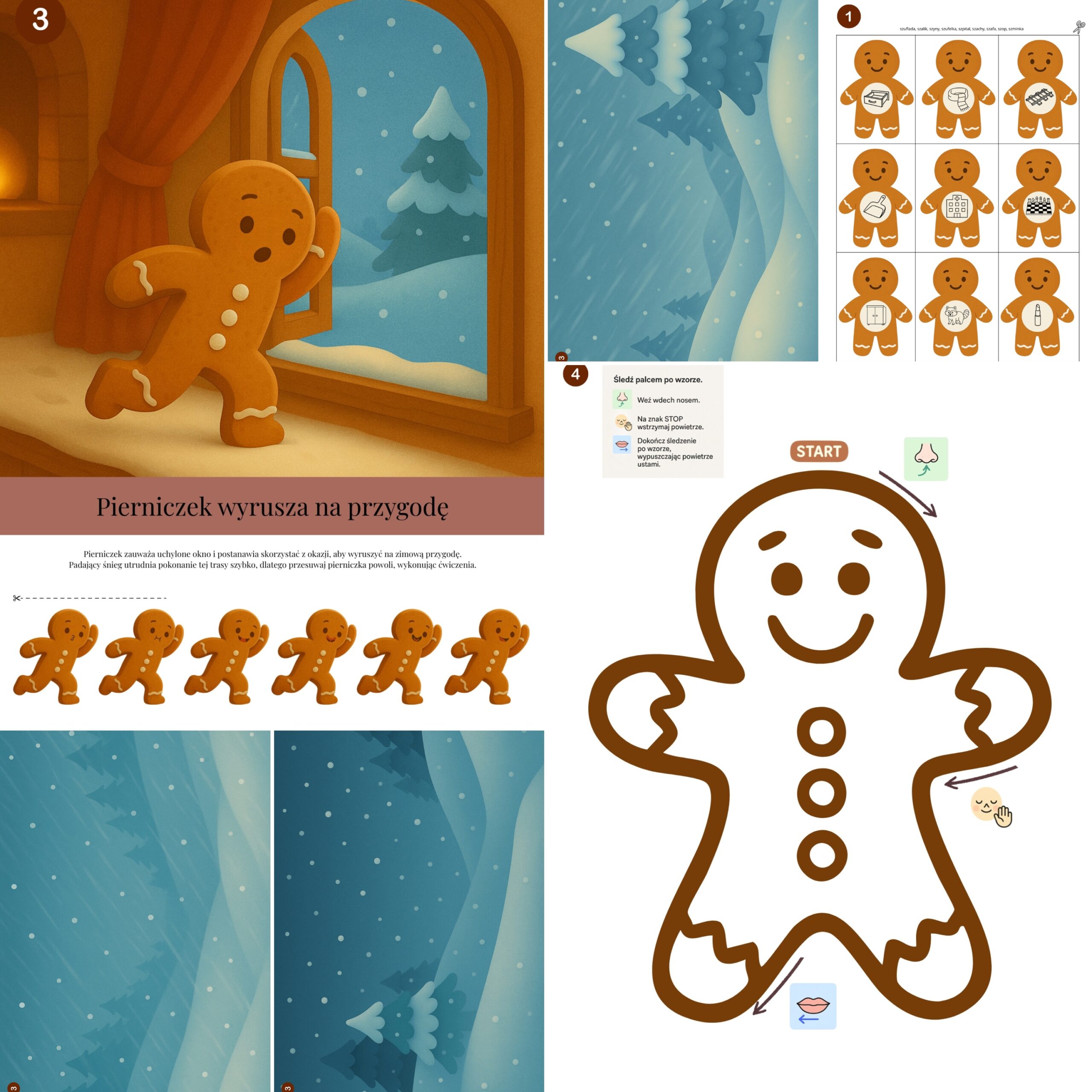„Przygody piernikowego ludzika” to 40-stronicowe karty logopedyczne stworzone specjalnie do prowadzenia ciekawych, zimowych zajęć grupowych. Materiał został zaprojektowany tak, aby prowadzący mógł poprowadzić całe spotkanie w oparciu o jedną spójną, zimową opowieść o pierniczku, który wymyka się z piekarni i rusza na wielką, mroźną przygodę.