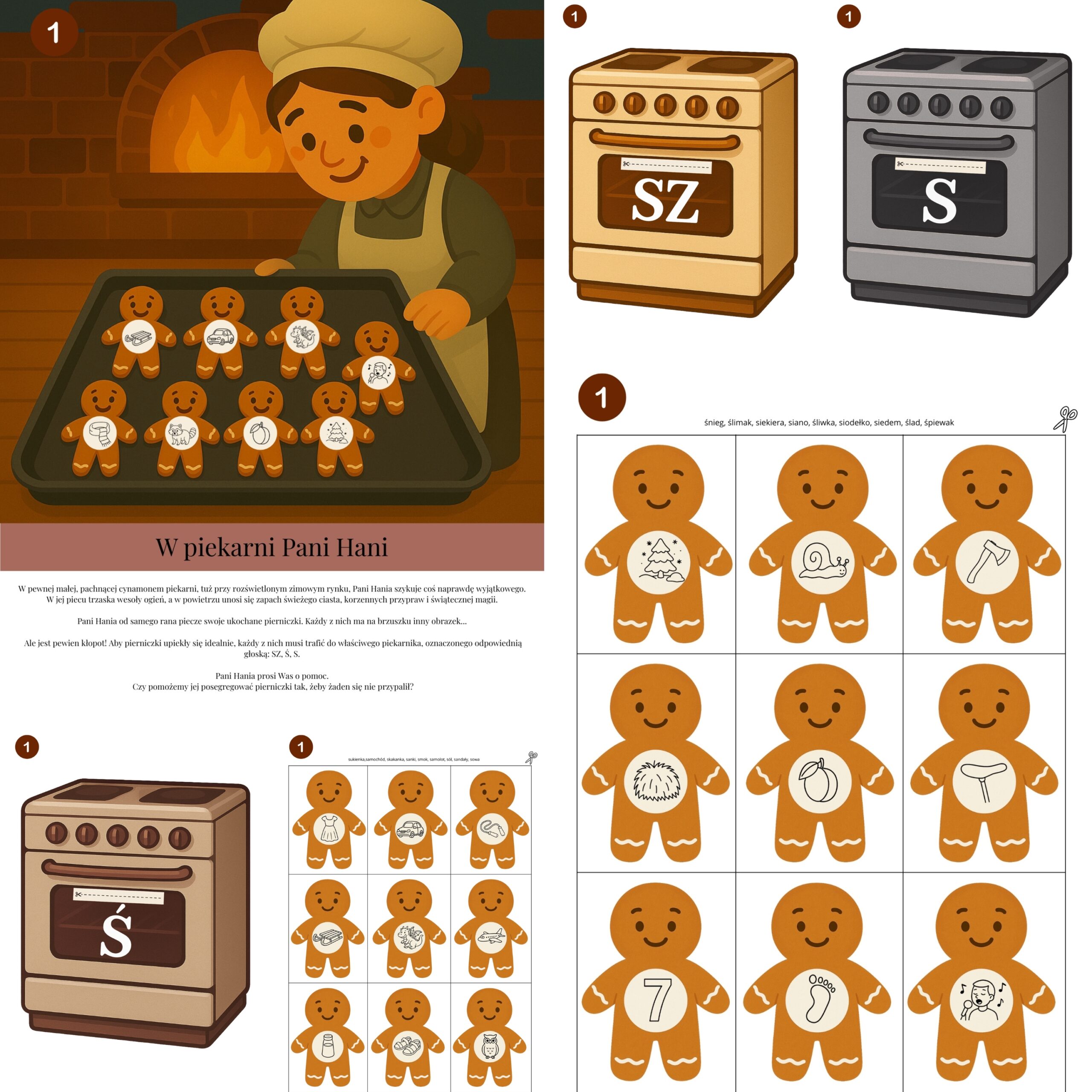 Zabawy słuchowe na rozpoznawanie i segregowanie pierwszej głoski – SZ, Ś i S – osadzone w piernikowych aktywnościach.
