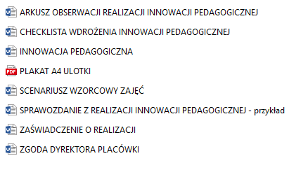 Pakiet obejmuje pełną dokumentację formalną innowacji pedagogicznej, gotową do wykorzystania w placówce: