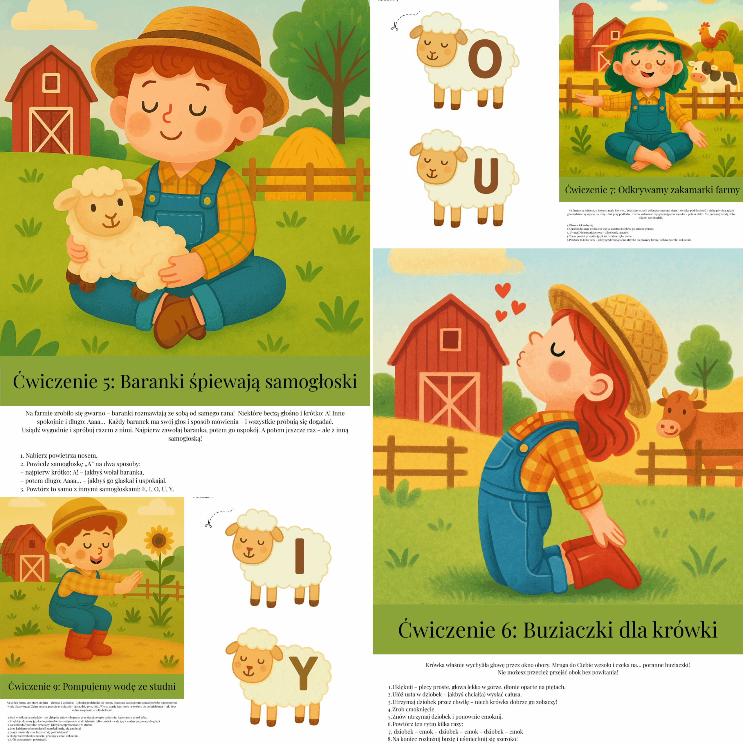 „Logo-joga na farmie” to gotowy zestaw kart logopedycznych do druku, który łączy ćwiczenia artykulacyjne, oddechowe i proste pozycje jogi – a wszystko w formie bajkowej przygody.