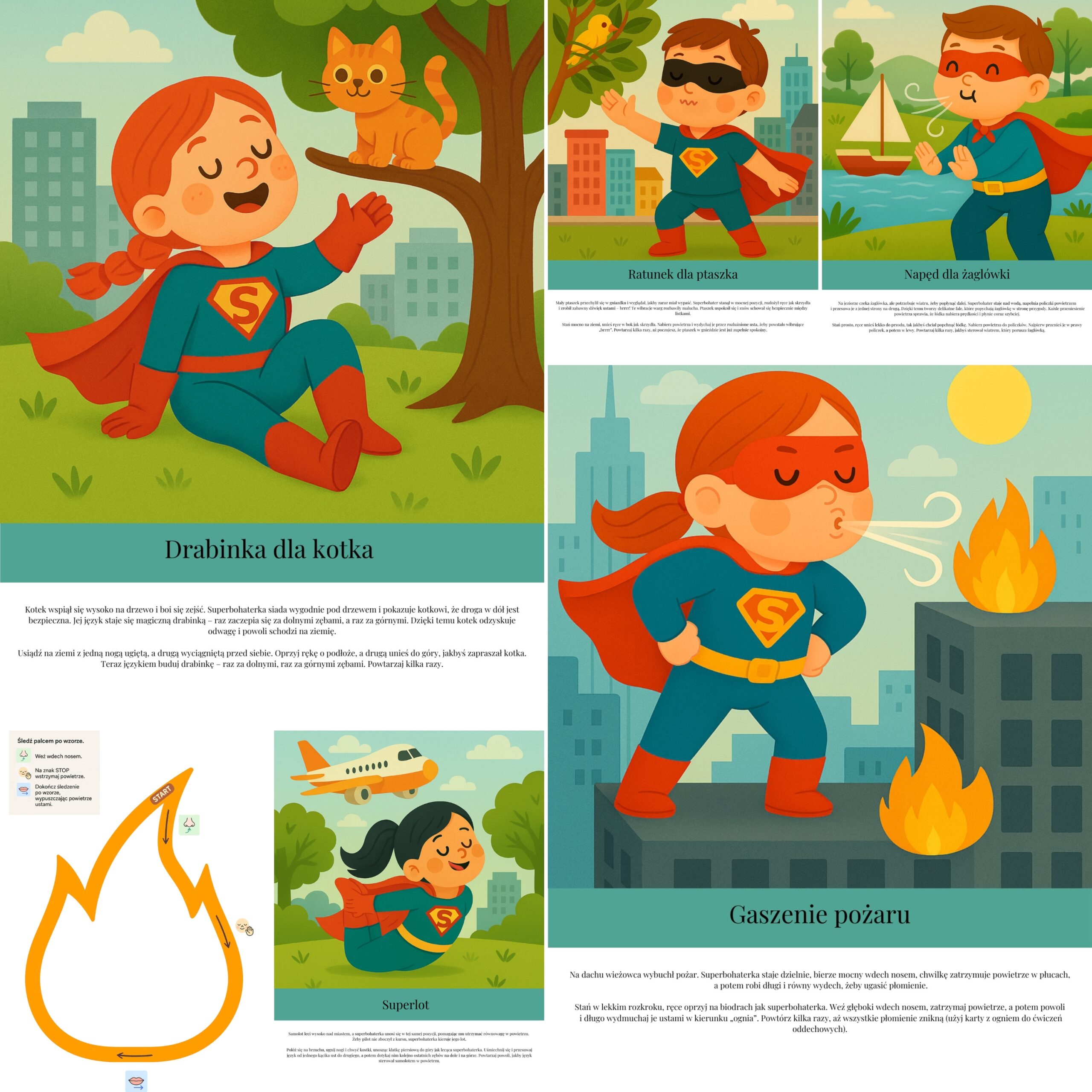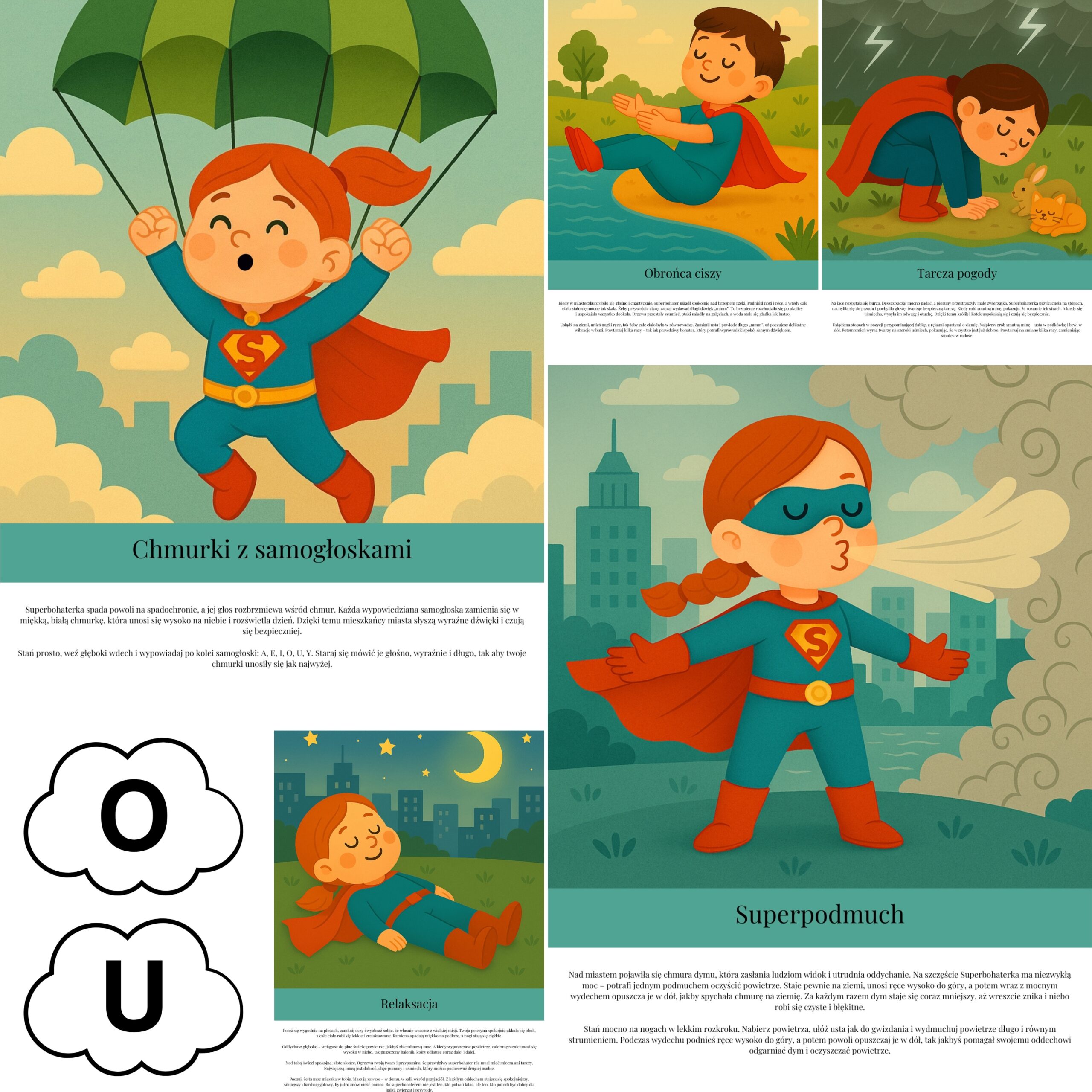 Karty prowadzą dziecko przez przygodę superbohaterów – bohaterów, którzy odkrywają, że największą mocą nie jest siła czy latanie, ale dobroć, chęć pomocy i uśmiech. Dzięki temu dziecko nie tylko ćwiczy aparat mowy, oddech i koordynację ruchową, ale także uczy się empatii i współpracy.